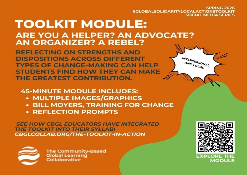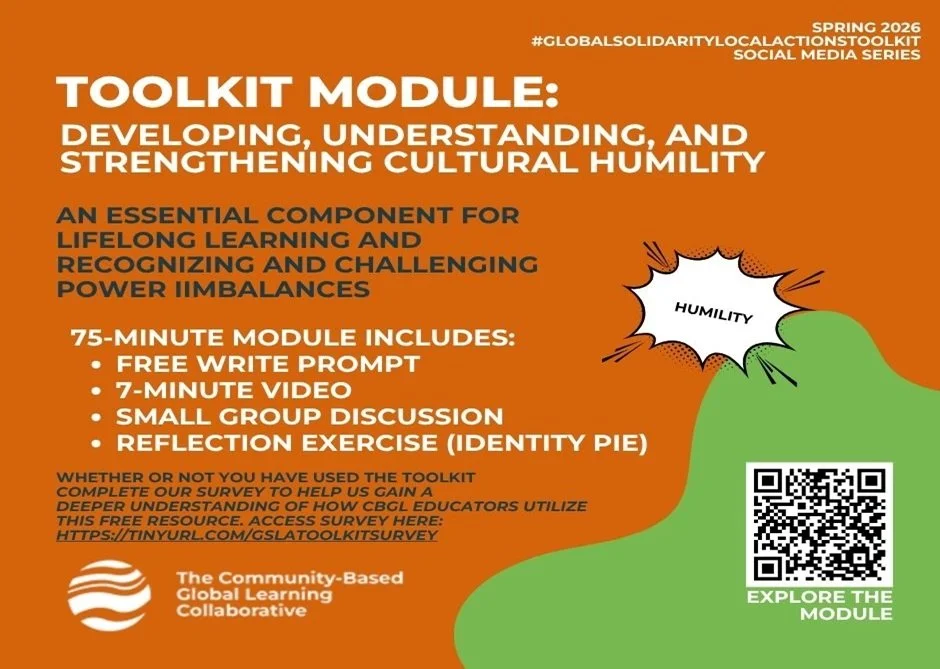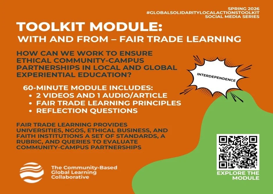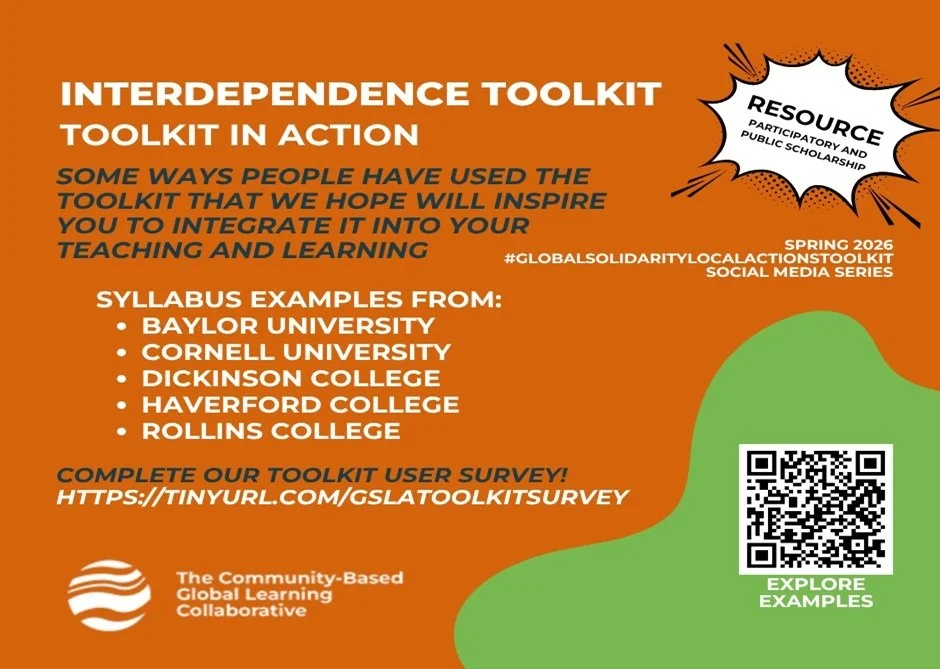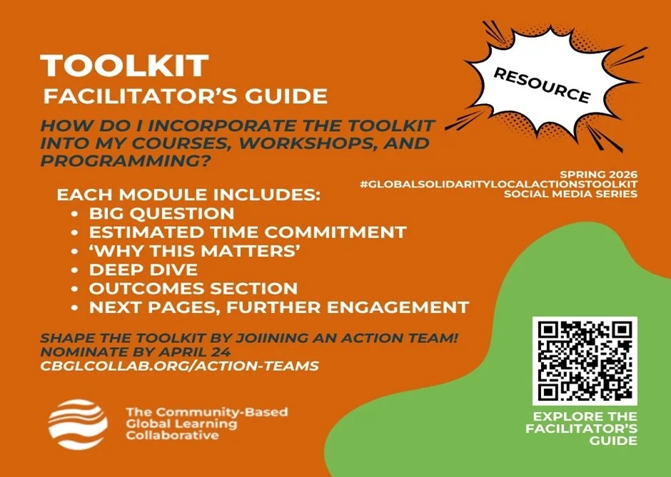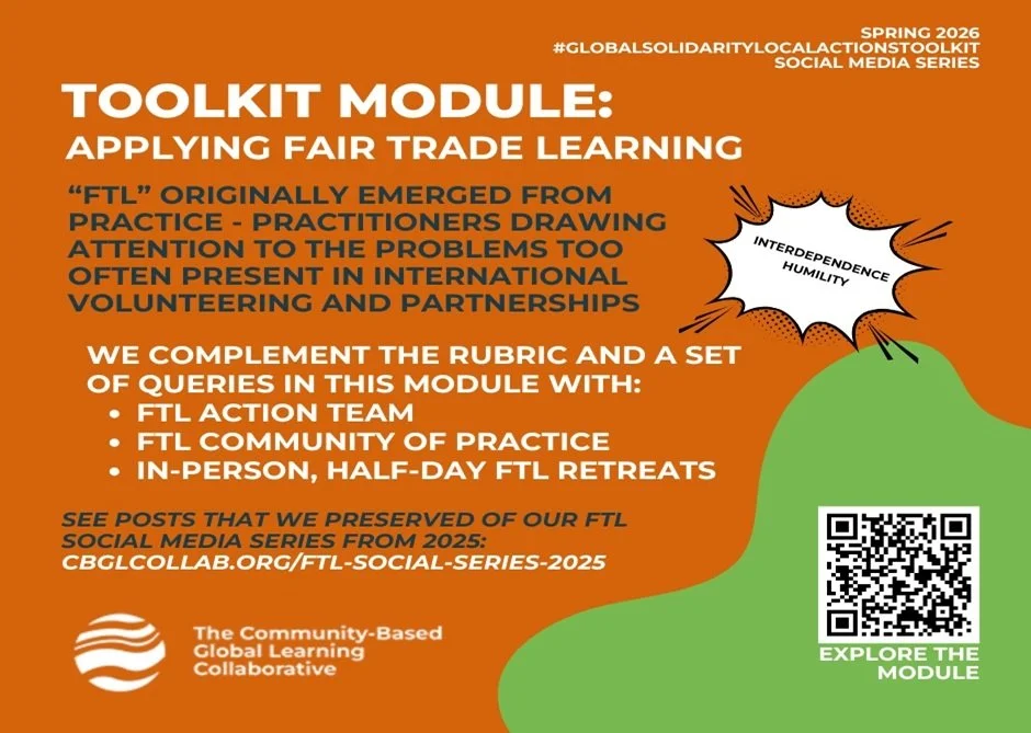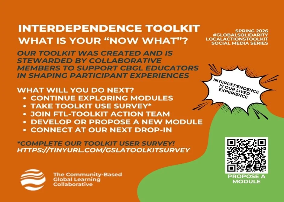 What is your next step? In this our 15th and final post of our #GlobalSolidarityLocalActionsToolkit 2026 social media series we invite you to strengthen our free online teaching and learning resource. We hope the series has inspired you to (re)commit yourself to designing community-based global learning content before, during, and after your participants’ CBGL experiences. Over summer and fall our FTL-Toolkit action team members will continue to interview respondents to our toolkit use survey. Drop-in on us anytime to ask a question or offer a story and stay connected through our newsletter and social media!