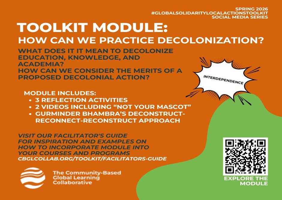 The Toolkit is a collective on-line learning and sharing initiative. It brings together educators and learners who all share a commitment to building more just, inclusive, and sustainable communities. This initiative naturally calls for open-source knowledge sharing; many who have used or are still using the Toolkit have given the Collaborative permission to share their syllabi, presentations, workshop outlines and publications. Our members model the ethos of the Toolkit, that interdependence is our lived experience, both in its creation and use. Join us in this work as either a dues-paying member or action team member – this is the final week to nominate for summer onboarding! Post number 12 in our #GlobalSolidarityLocalActionsToolkit 2026 series.