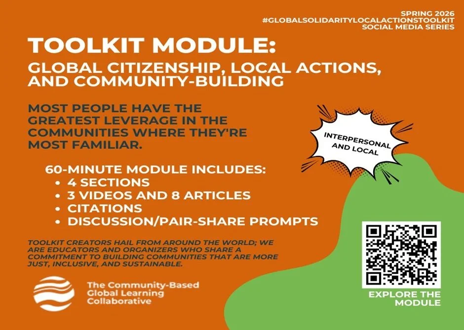 What does global citizenship have to do with local actions and community-building? The Collaborative is interested in global justice, and the resources in this module help us all think about the relationships among how we identify, interdependence, and local actions. The mere act of crossing a border does not dispose a person to collaborative, ethical, and informed capacities to co-create more just, inclusive, sustainable communities. The challenge of cosmopolitanism draws us back to a compelling question in an unmistakably interdependent world: what obligations do we have to one another? This post is the second in our #GlobalSolidarityLocalActionsToolkit spring 2026 social media series.