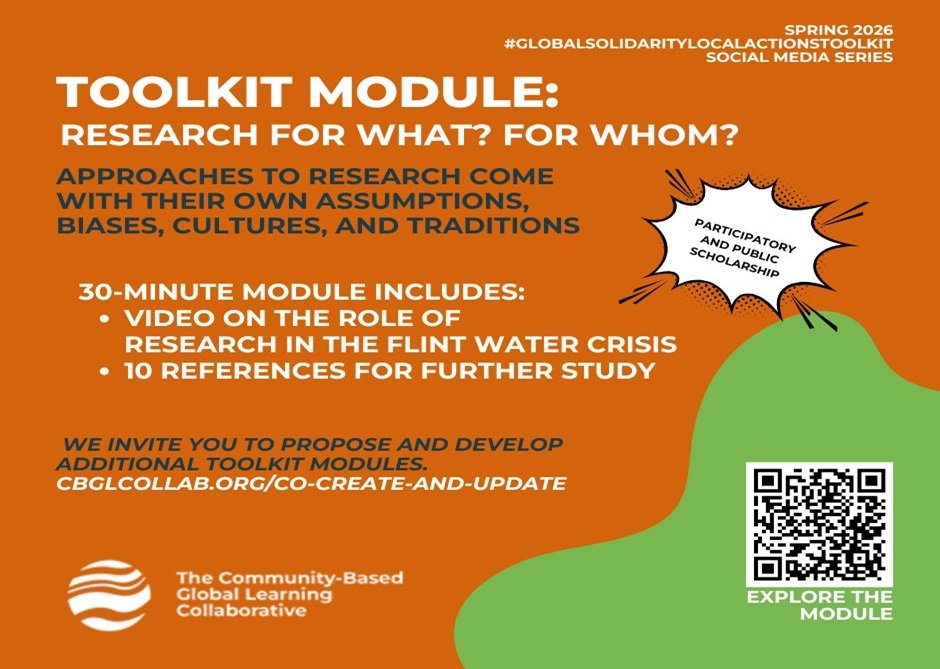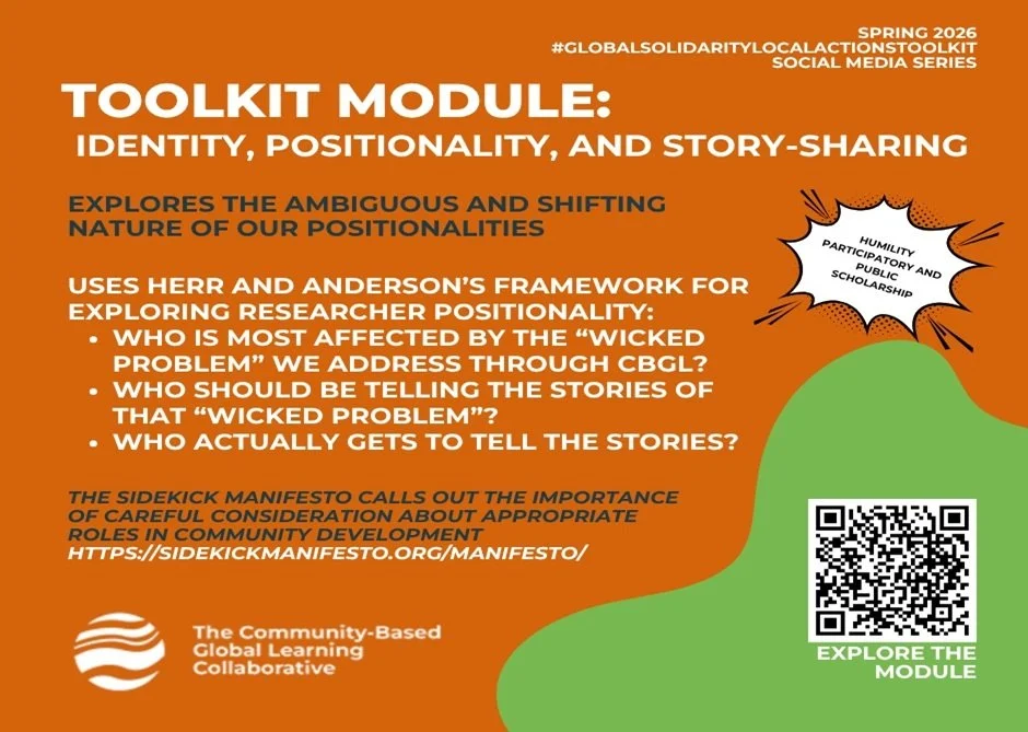 This is an excellent module for community-based, undergraduate, graduate, and faculty researchers! The pages of our #GlobalSolidarityLocalActionsToolkit are open-access and co-created by a wide variety of CBGL practitioners. Our positionality relates to how we might share stories to advance positive social change. If I am an academic-based researcher, what is my role in a long term process of community development that is historically anchored and culturally sensitive? This module references Herr and Anderson’s continuum that highlights both the ambiguous and shifting nature of researcher positionality. Access the module here.