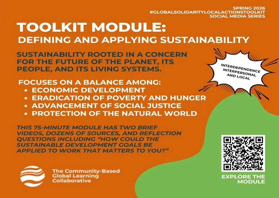 This module defines and connects sustainability with global solidarity and local actions. It contains references to the United Nations Sustainable Development Goals and asks students to identify, target, and map local actions and outcomes back to the UNSDGs. The Collaborative believes that solutions for the planet cannot be at the expense of people or our economy, and people and the economy are core to creating the needed progress for our planet. One of the many resources on this module is Kevin Kecskes Sustainability of Our Planet and All Species as the Organizing Principle for SLCE. Together with other modules in the #GlobalSolidarityLocalActionsToolkit we ask, how do we improve the human condition equitably in this and future generations, while conserving environmental systems necessary to support healthy and vibrant societies? Post number 13 in our 2026 series.